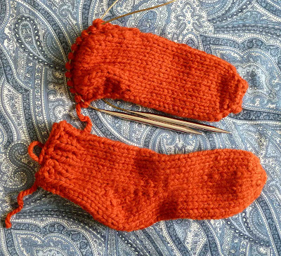 With more of this yarn at home (which is not radioactive tangerine!), I was able to finish these last night. They join a pair in adult woman size that's a Christmas present for the same friend who is getting the Autumn Leaf scarf. It sure feels good to knit from stash and check gifts off the list early!