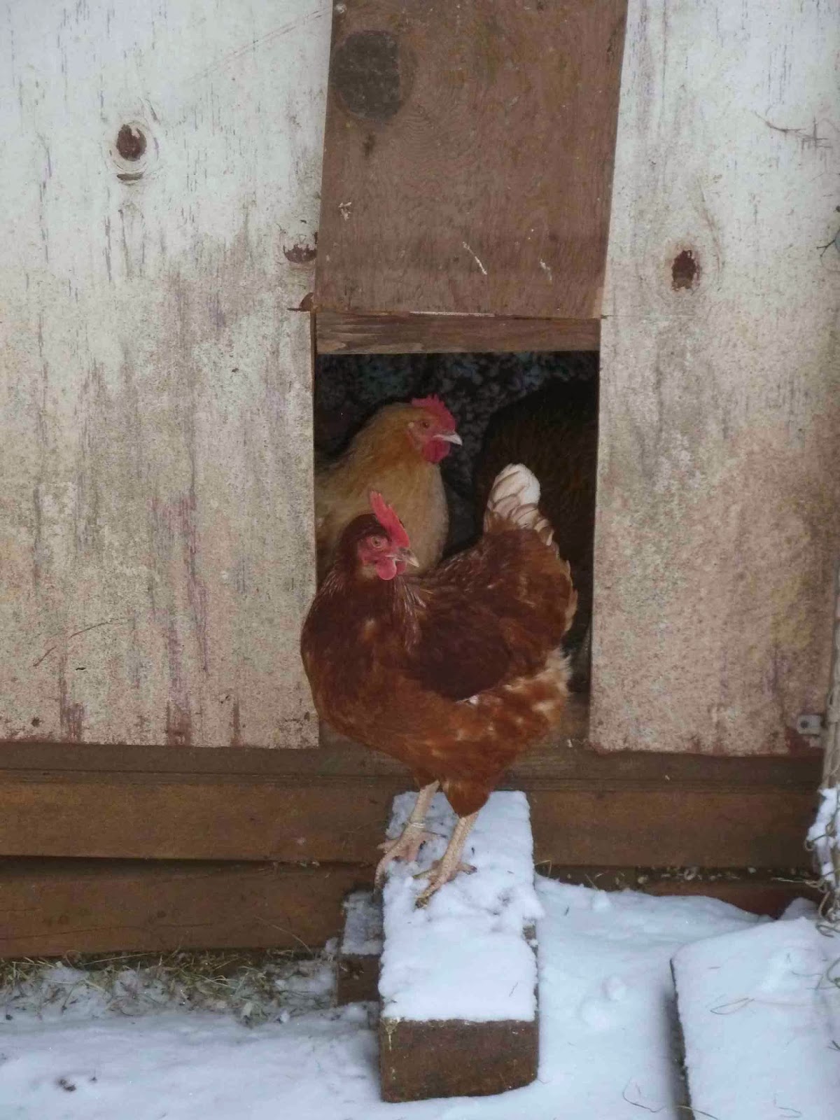 The chickens, on the other hand, had not ventured out of their shelter – or rather, their coop! Their run is covered, but the wind had blown a skiff of snow over the ground and apparently our hens can't walk on "water;" there was not a single track in their yard. They remembered, too; there was none of the usual eruption of feathered bodies when I opened the pop door this morning. One red sexlink ventured out onto the ramp...