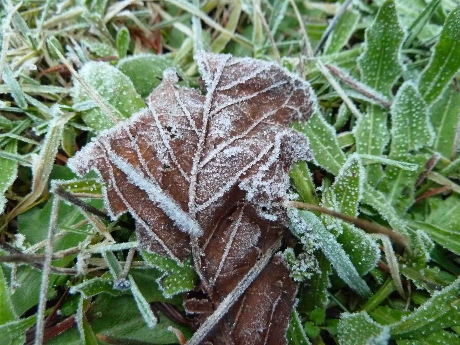 We haven't had a lot of frosted leaves this year, so these were a treat this morning. When I got to the barn I thought I saw ice, but realized they were scattered dove feathers when I got closer: